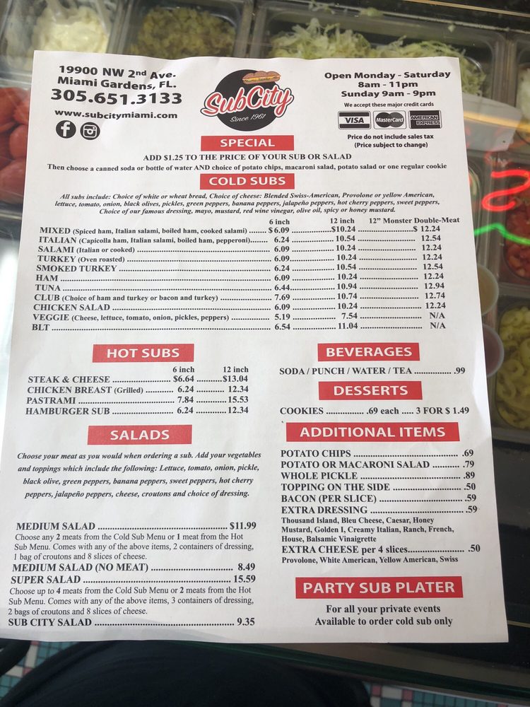 Sub City, located in Miami, FL, offers a variety of wraps, salads, and sandwiches. The restaurant is known for its divey, casual atmosphere, making it a great spot for lunch or group gatherings. With options for delivery, takeout, and catering, Sub City caters to a wide range of preferences. The menu features a Thanksgiving special, including a delicious 8 turkey sub with double meat. In addition, the 6 cold subs offer a variety of choices, such as the Italian Cold Sub with Capicola ham, salami, and pepperoni. For those craving something warm, the 6 hot subs like the steak and cheese or grilled chicken breast are popular choices. With options for outdoor seating, waiter service, and even Wi-Fi, Sub City provides a comfortable dining experience for all customers. Dine at Sub City for a satisfying meal that will leave you coming back for more.